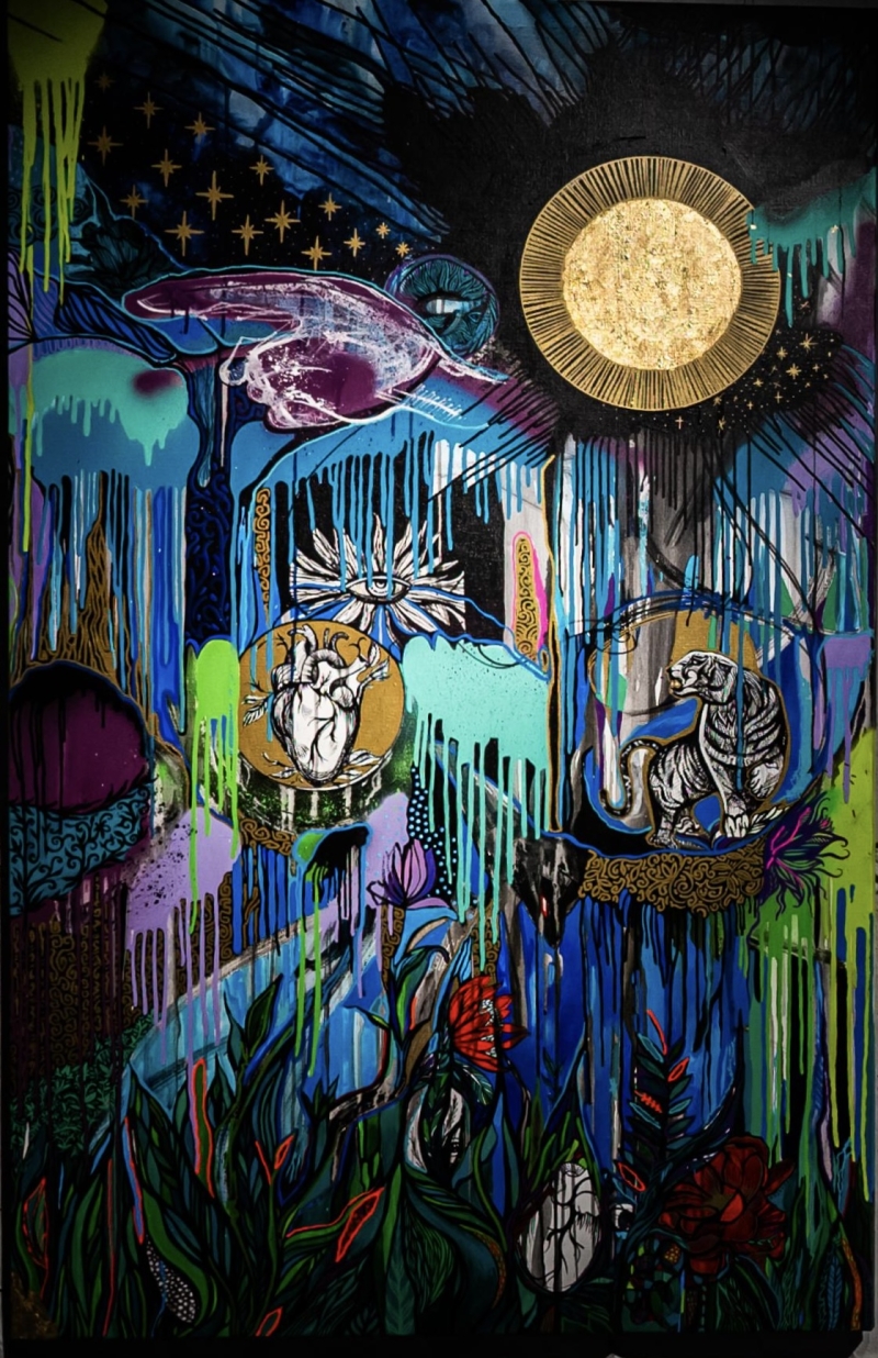 Полотно, акрил, поталь, акрилові маркери, масляна пастель.