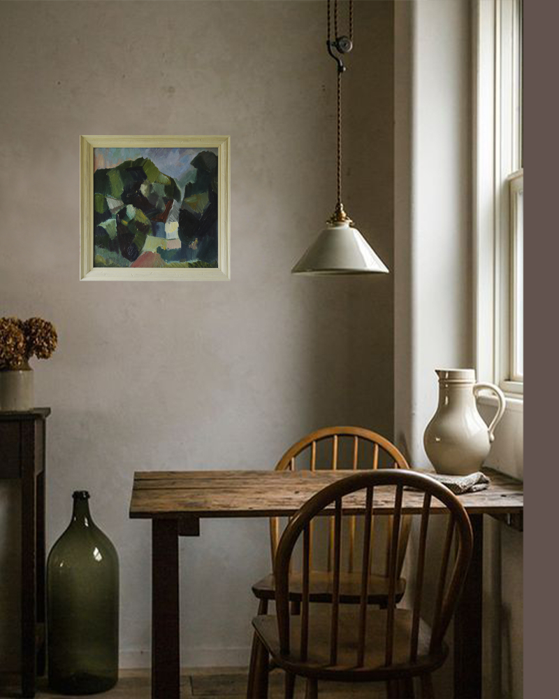 Цю картину я написала влітку, коли гостювала у бабусі в селі на етюдах. Бабусі вже немає, і будинок нам більше не належить — востаннє я була там 14 років тому. Це мій спогад про безтурботне літо: будинок, що ніби потопає в зелені дерев, які створюють для нього захисний кокон. Згодом картину оформили в раму, і певний час вона була в моїй особистій колекції. У 2022 році, під час обстрілу Харкова російською авіацією, картина впала зі стіни в коридорі, де я ховалася зі своєю сім’єю. Робота не постраждала, однак на тильному боці рами з’явилася невелика тріщина, а правий верхній кут із лицьового боку трохи деформувався. Цю ваду видно на фото — і з тильної, і з лицьової сторони. Спочатку я планувала замінити раму, але згодом усвідомила, що ця тріщина стала частиною історії картини, її концепції — свідченням пережитого. Картина унікальна, оскільки належить до раннього періоду творчості мисткині. Нині Марія працює в іншому художньому напрямі.