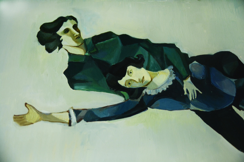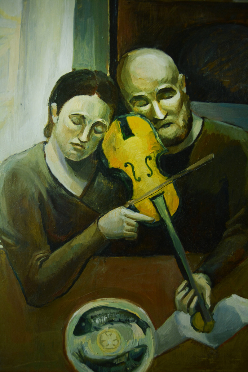 Це моя дипломна робота, створена під час навчання у Харківському художньому училищі. Мені тоді було 18 років. Довгий час я не могла розлучитися з цією картиною, вона була для мене дорогою пам’яттю, символом завершення важливого етапу. Робота зберігалася у моїй особистій колекції, але тепер я готова її відпустити. У картині використано фрагмент з відомого твору Марка Шагала «Над містом», де художник зображує себе з дружиною Беллою у польоті. Цей мотив я трактую як алегорію ідеального, піднесеного кохання, радше навіть нашого уявлення про нього, ідеалізованого й недосяжного. У нижній частині композиції зображена пара, що намагається разом грати на скрипці, створюючи спільну мелодію — алегорію земного кохання. Простір картини чітко зонований: кожна пара має власну площину існування. На тлі центральної частини — силует міста з вуглуватими, агресивними формами будинків. Цей контраст підкреслює крихкість людських почуттів. Місто живе своїм життям, усе відбувається у звичному ритмі, але навіть у цьому круговороті народжується щось прекрасне, те, що, я сподіваюся, із земного кохання здатне перетворитися на любов небесну, не розбившись об реалії життя.