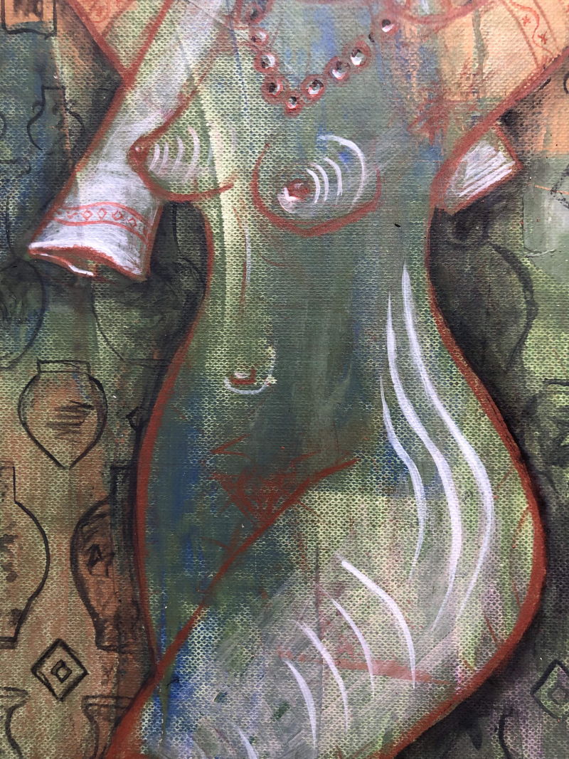 Чи помічали Ви, що багато посудин і ваз нагадують жіночу фігуру? З давніх часів амфора вважалася символом життя; давні люди вірили, що в ній зберігається жіноча душа. Героїня цієї картини дивиться на глядача без збентеження й кокетства, усвідомлюючи, що кожна жінка — неповторна й багатогранна. Саме тому з покоління в покоління художники не можуть встояти перед такою красою, намагаються вловити погляд, легкий рух, розкрити приховані риси характеру й передати у своїй картині справжній, прекрасний образ жінки.